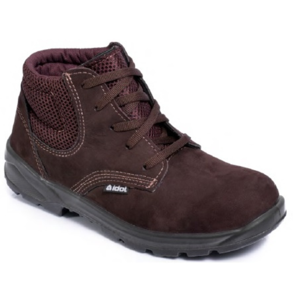 Botina de segurança com fechamento em atacadores, confeccionado em couro Nobuck café, lingueta acolchoada, colarinho acolchoado, forro interno na gáspea não tecido, biqueira plástica, palmilha de montagem em E.V.A 4,00 com tratamento antimicrobiano. Forma alta e larga que propicie conforto e um bom calce de acordo com as normas e escala francesa.