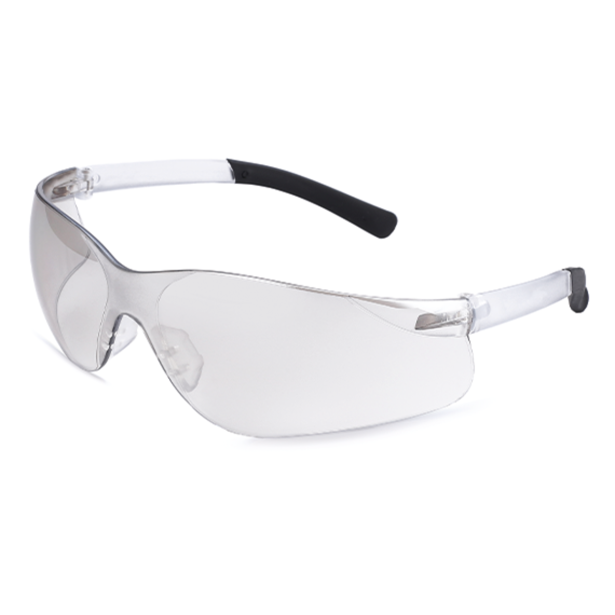 Óculos de segurança constituído de armação e visor confeccionados em um única peça de policarbonato, com apoio nasal. As hastes do tipo espátula são confeccionados do mesmo material do visor. Lentes em policarbonato com apoio nasal Tratamento antirrisco e proteção UV• Armação em policarbonato