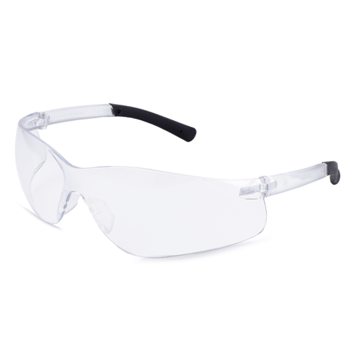Óculos de segurança constituído de armação e visor confeccionados em um única peça de policarbonato, com apoio nasal. As hastes do tipo espátula são confeccionados do mesmo material do visor.