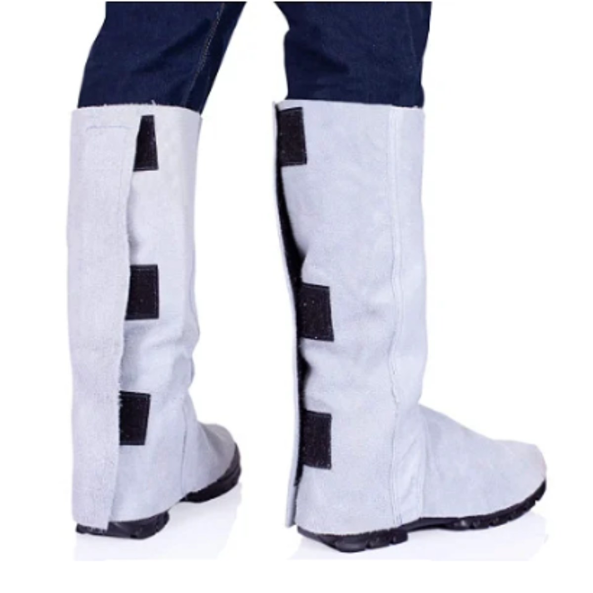 Perneira de segurança, confeccionada em raspa de couro bovino curtido ao cromo, com fechamento lateral total em velcro, com tira de raspa na parte inferior fechada com velcro.